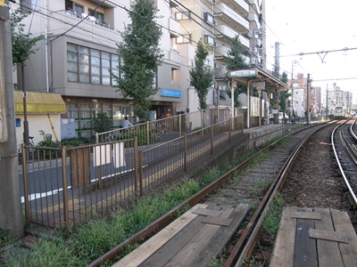 三ノ輪橋方面ホームから早稲田方面ホーム 踏切を挟んでホームが配置されています。