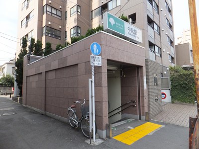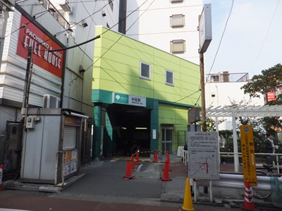 A3出入口は東急中延駅の近くにある出入口で、緑色の目立つ建物です。写真左手前に東急の駅があります。