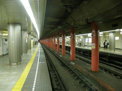 相対式2面2線の線路配置で、上下線間の柱は朱色に塗られています。